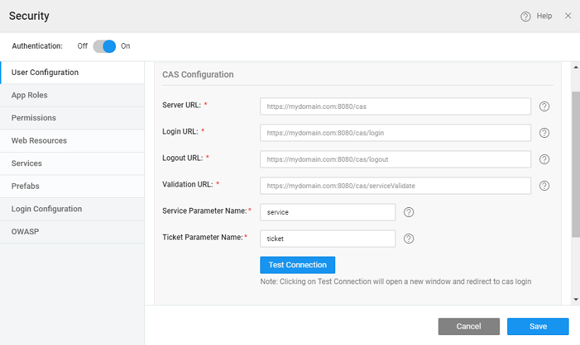 To set up authentication using a Central Authentication Service in WaveMaker apps, enable from the security dialog, choose CAS as the Security Provider.