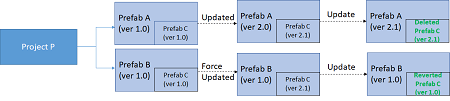• If Project P updates Prefab A to ver 2.1, then the Prefab C in Prefab B will be reverted to the original ver 1.0.