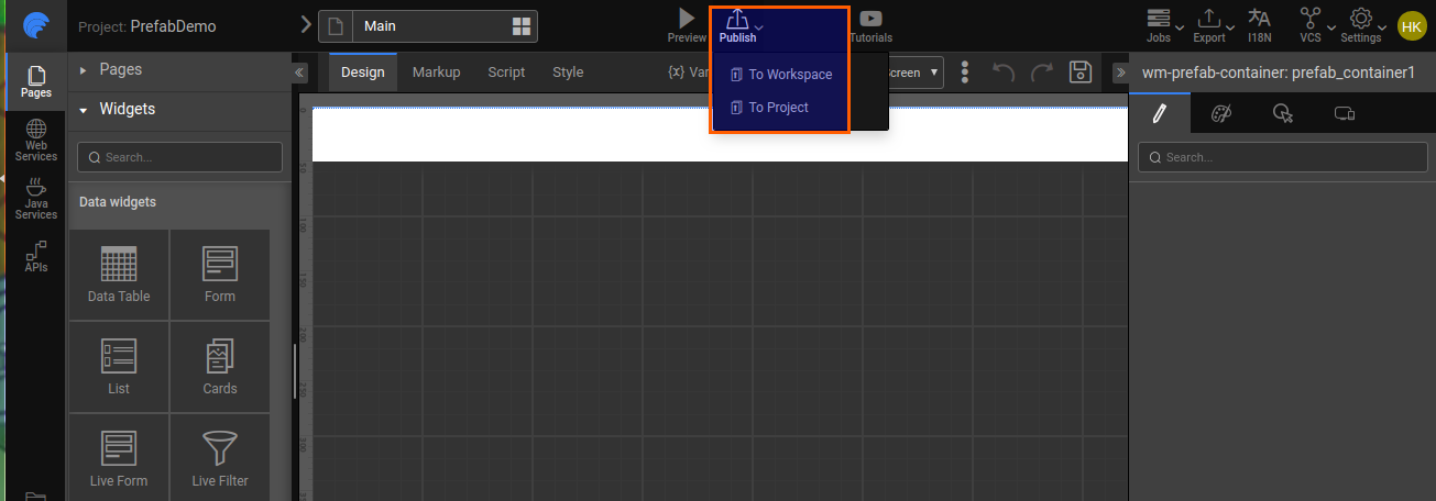 Using the Publish to Workspace option from the Main Menu listed under the app name, you can make your Prefab available across all projects within your workspace. Once Published the Prefab will be displayed in the Prefab section of the Widgets Panel under the category specified at the time of publishing. If you want to share the Prefab with another WaveMaker Developer, Export the Prefab as Zip. This zipped file can be imported from the Prefab section of the Project Workspace.