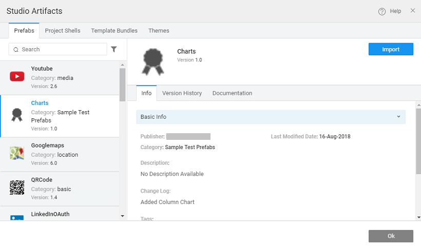 • After the Admin's approval, these Prefabs will be available for import from Prefabs dialog under Artifacts dropdown.