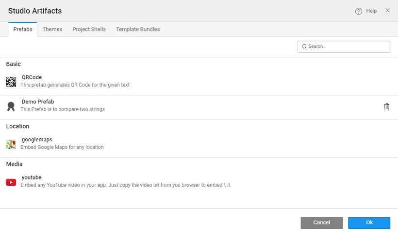 Updated Prefabs: By updating the Prefab version while publishing the Prefab will update the version and the latest version will be available across all the projects. When a project using this Prefab is opened,  the developer will be prompted to update the same within the project. When you open a project using the Prefab (i.e the Prefab was dragged and dropped onto the canvas) you will see a dialog asking you to update the Prefab You can choose to update or continue with the previous version. In case you choose to continue with the previous version, whenever you try to drag and drop the Prefab, you will be prompted to update the same.