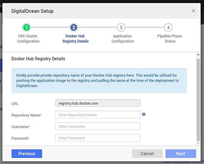 1. Registry Url: Currently this is fixed to registry.hub.docker.com as we are supporting only the docker hub registry for now.