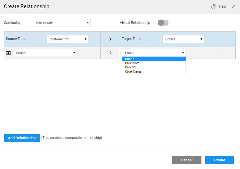 - One-to-Many Composite relation is possible when Table 1 has the composite keys and Table 2 has at least one non-Composite key column selected.
