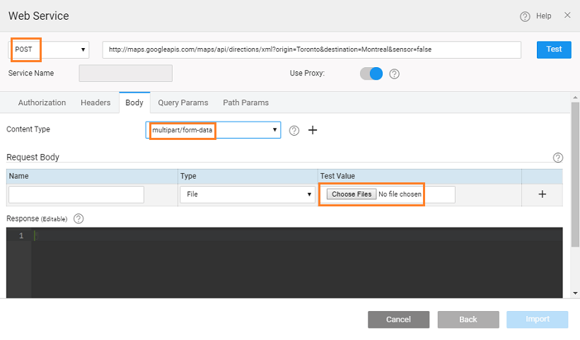 When importing REST Service which requires string or file as input, set the Content Type from Body tab to multipart/form-data to see the options for the Request Body parameters. The type of these parameters can be set to: