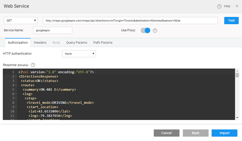 3. You can make changes to the service settings. Once you make the changes, Test the changes before saving them. This is particularly helpful when the REST service has undergone any changes or when it needs additional input parameters. You can see the Response Format from the REST service in the JSON format as required by the platform. Post ver 9.1 release, you can make changes to the Authentication option, too.