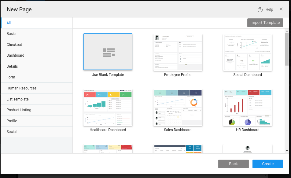 • For developer convenience, the Templates are categorized as Travel, Basic, Sales, Healthcare, General, Finance, Human Resources, Social, Admin, and E-Commerce. For Hybrid Mobile Apps these templates are categorized as a card, chart, dashboard, menu etc.