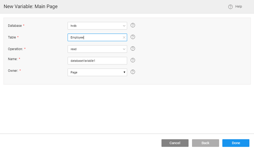 Database CRUD Variable connects to an individual database entity through auto generated CRUD APIs. It contains the values from the specified database table and controls such as Live Form require a Database CRUD Variable as input.