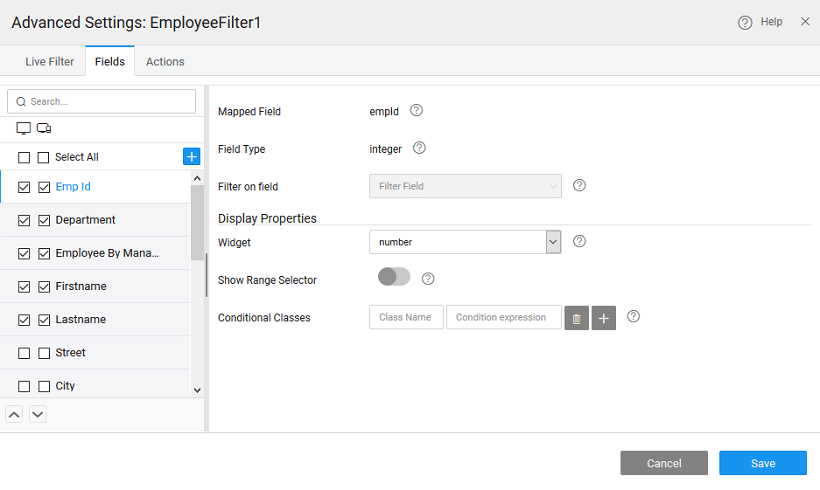 Filter Fields can be set from the Fields tab of Advanced Settings property. Using this option you can select the columns for display on the Live Filter. Ordering can also be changed by using the buttons at the bottom of the designer window. Further, you can set: