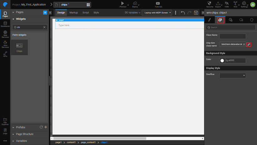 9. From the Data tab, bind the values to those returned by the Chips widget.