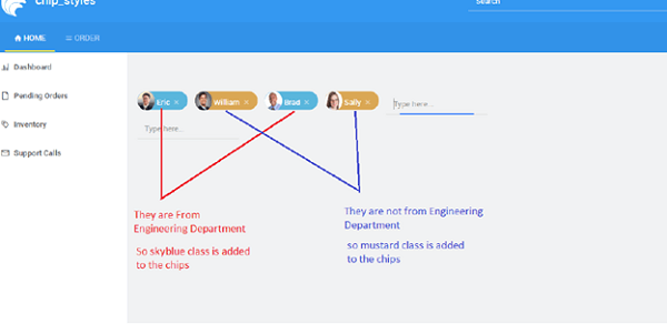 1. Setting the chip item class name (or Class Name property) as skyblue, will apply skyblue class to all the chips at runtime.