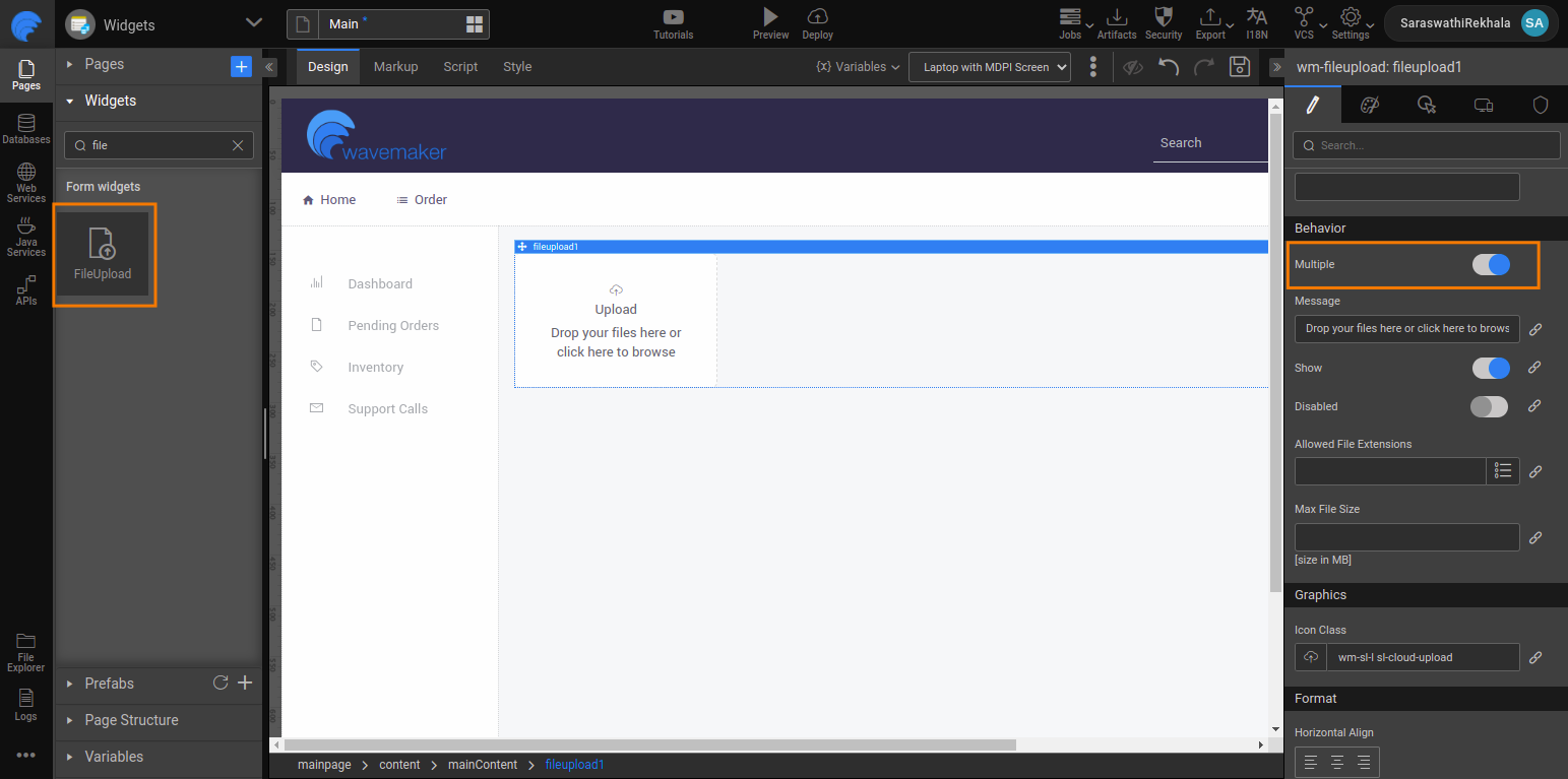 1. Drag and drop a FileUpload widget onto the canvas.
