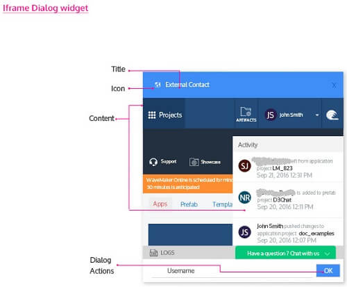 An Iframe Dialog is a popup window that displays content from an external source (URL) in a dialog. It has an URL property, where you mention the external source for the content.