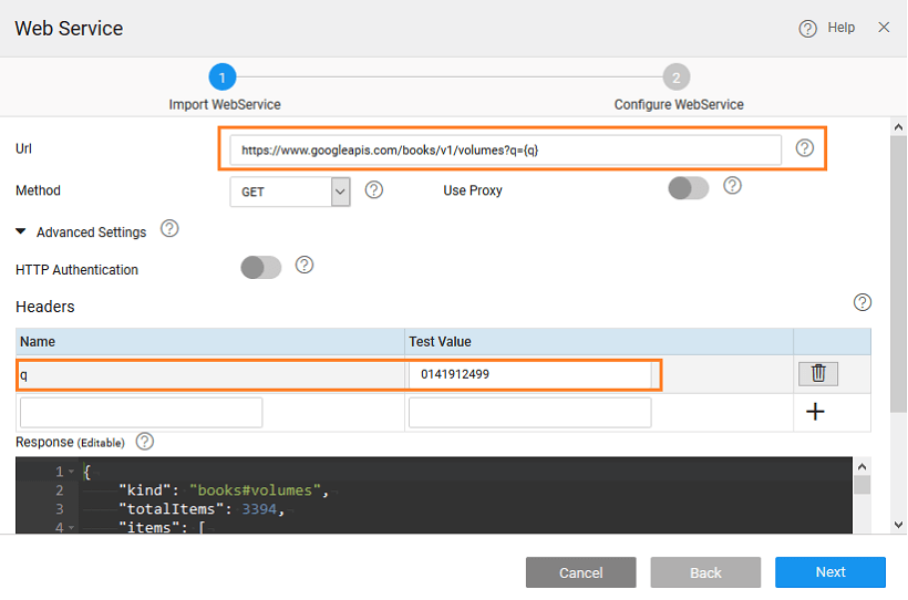 3. Use the following Url: https://www.googleapis.com/books/v1/volumes?q={q}