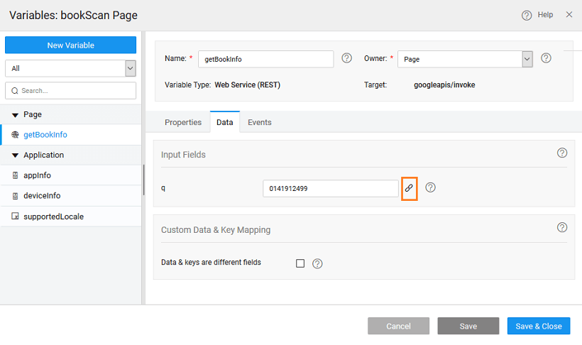 1. Bind the value of q with barcode scanner ‘dataValue’ property and save the variable.