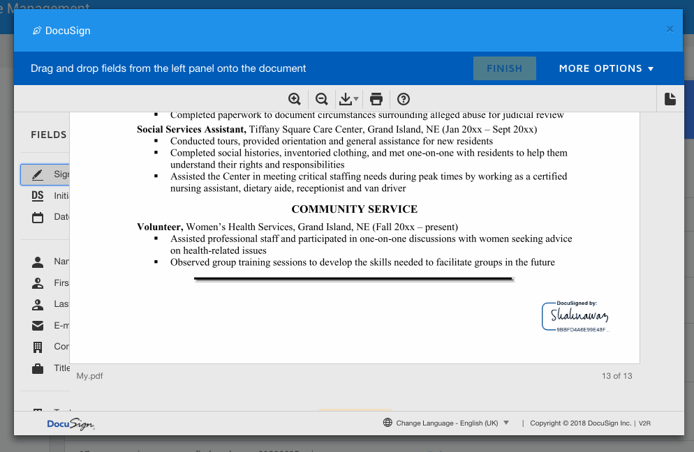 With the above steps done your Docusign prefab integration is complete. Now clicking on the E-sign link will invoke a Docusign dialogue and the your document will appear in the dialogue. Click continue to start the e-signing process. Click on the e-signing options from the left menu and e-sign the document. Then click finish button in the popup to complete the process.