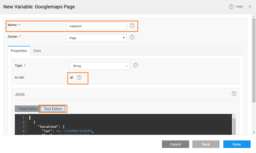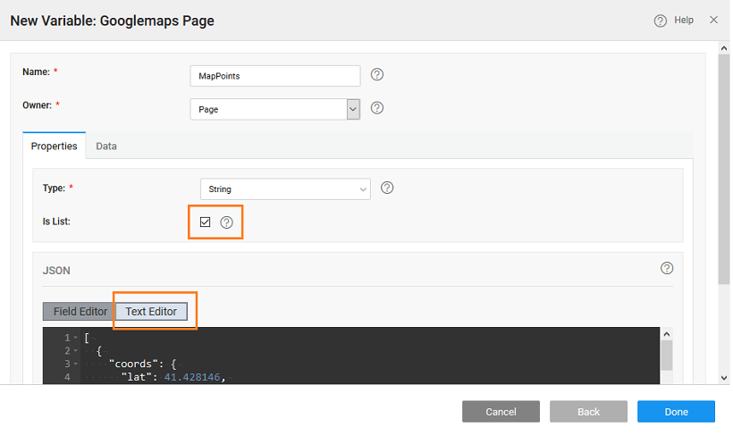 - Create a custom variable as per your requirements. Know more from here. Then enable the isList property, and enter the appropriate JSON in the Text Editor.