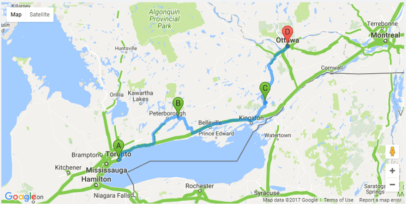 - the Waypoints a location which needs to be included in the route from the origin to destination,