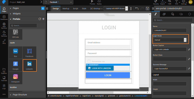 4. Drag and Drop the LinkedIn Prefab from the Prefabs Tab under OAuth.You can use the default login page created by WaveMaker.