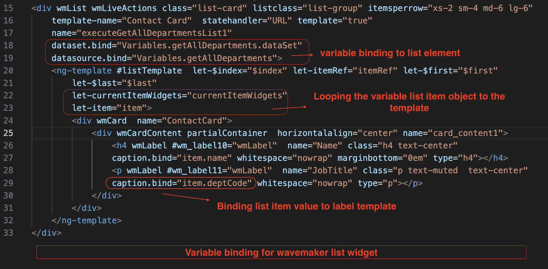 - Attribute binding: Developers must follow the WaveMaker-defined method for attribute binding while working with its components.