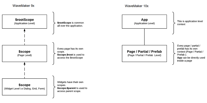 Apps in WaveMaker 10 have two independent contexts instead of the scope inheritance model of WaveMaker 9x: