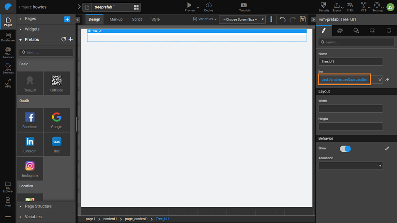 1. From Main Menu use Create option to Create a Static Variable, defaultTreeData, to hold the default tree structure. Select the is List option and enter the Json structure. The structure needs to include id, title, and nodes for subitems.