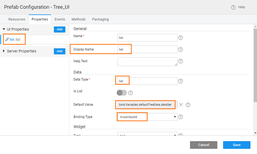 1. You can bind the prefab list property to any list and change the tree structure. We have created a static variable with the following structure and bound it to the list property.