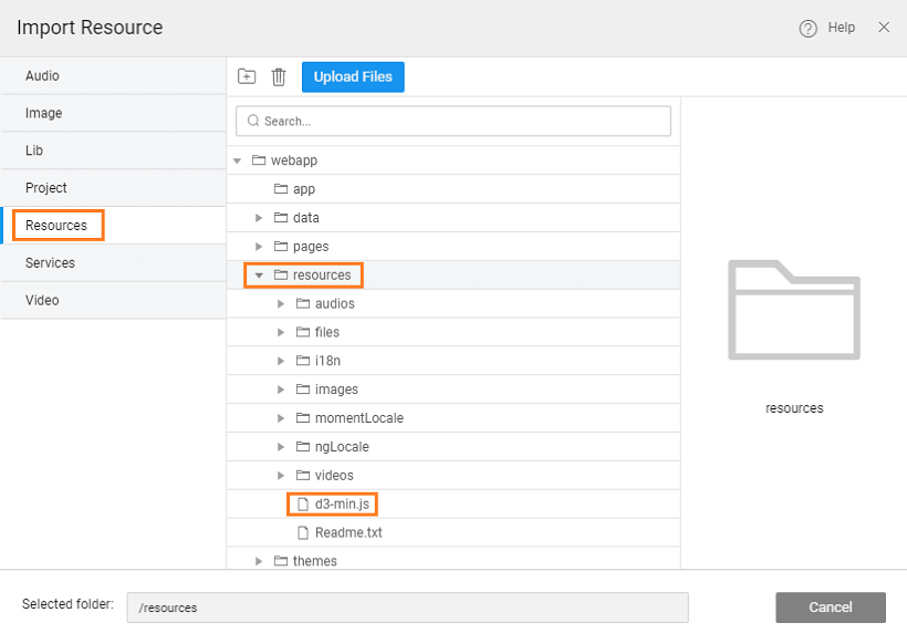 6. Import Resource, to import the d3-min js file (download and extract the file) into the Resource folder of your Prefab.