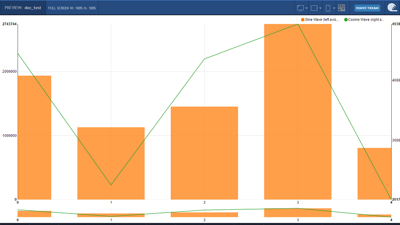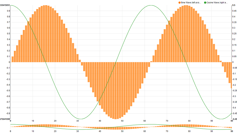 6. Enter the following code (you can copy and paste the same). This code generates the sin and cosine values that can be represented on the chart. Note that for the sin values, the bar attribute is set to true, thus the sine values are represented as bar chart while cosine values are represented as line graph. Click here for the code.