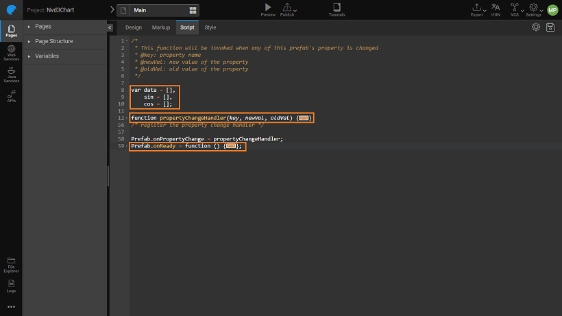 Enter the following function, too, within Prefab.onReady function after the above code. This code is to set up the visual rendering of NVD3 chart. Click here for the code