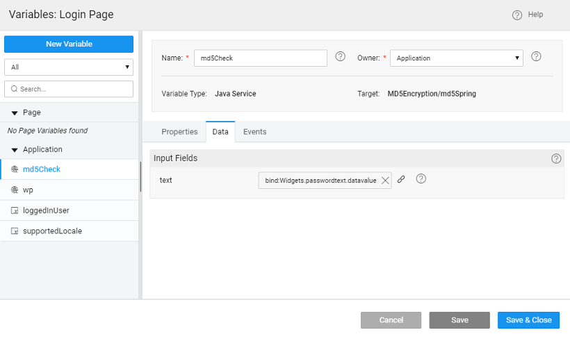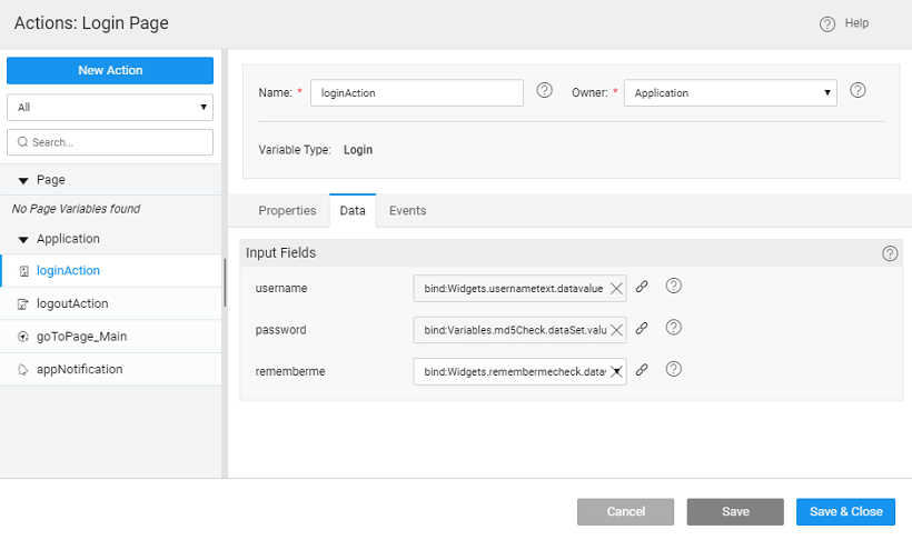 • Set the onClick event of the Sign In to loginAction. This will ensure that when any user logs in, the password is encrypted before checking it against the database by the login variable.