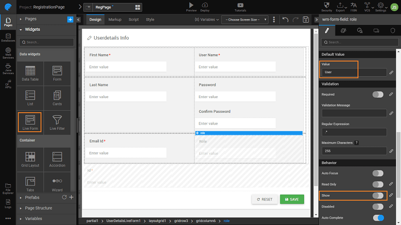 • Set default value for Role field to 'User' and set it as hidden.