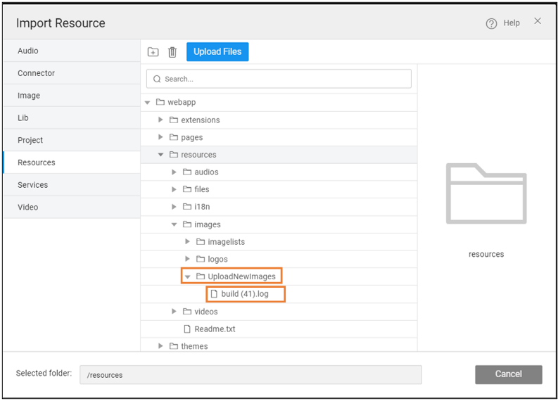 The uploaded file is available in the Import Resource window under Resources in the path mentioned in the Java Service. You can view the created directory and file in the below image.