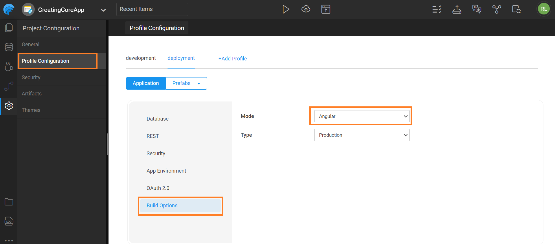 1. Next, go to Settings > Profile Configuration. Switch to deployment and navigate to Build Options to set the build mode to Angular.