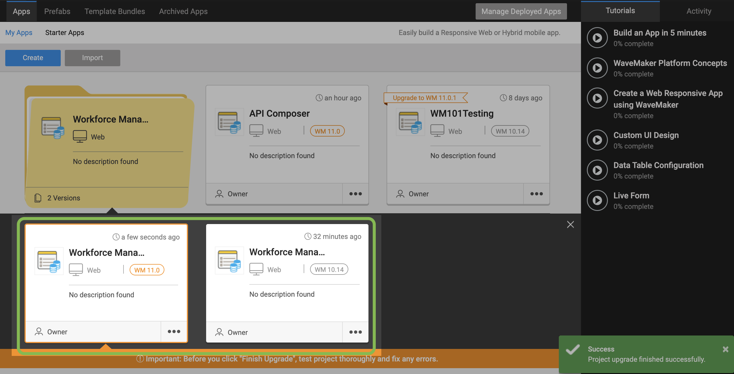The project dashboard alerts you that a newer version, WaveMaker 11, is available and will prepare you for the upgrade.