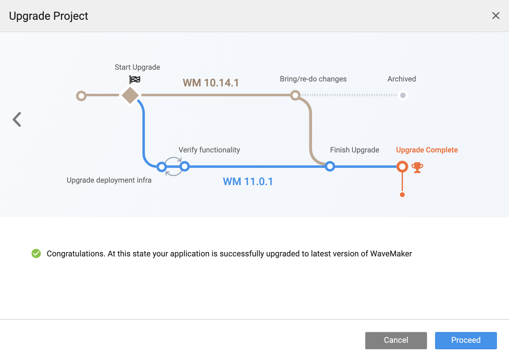 This step initiates upgrading the project to WaveMaker 11, and you will notice two project cards.