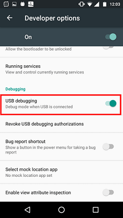 • Go to Settings > Developer Options. Enable USB debugging.