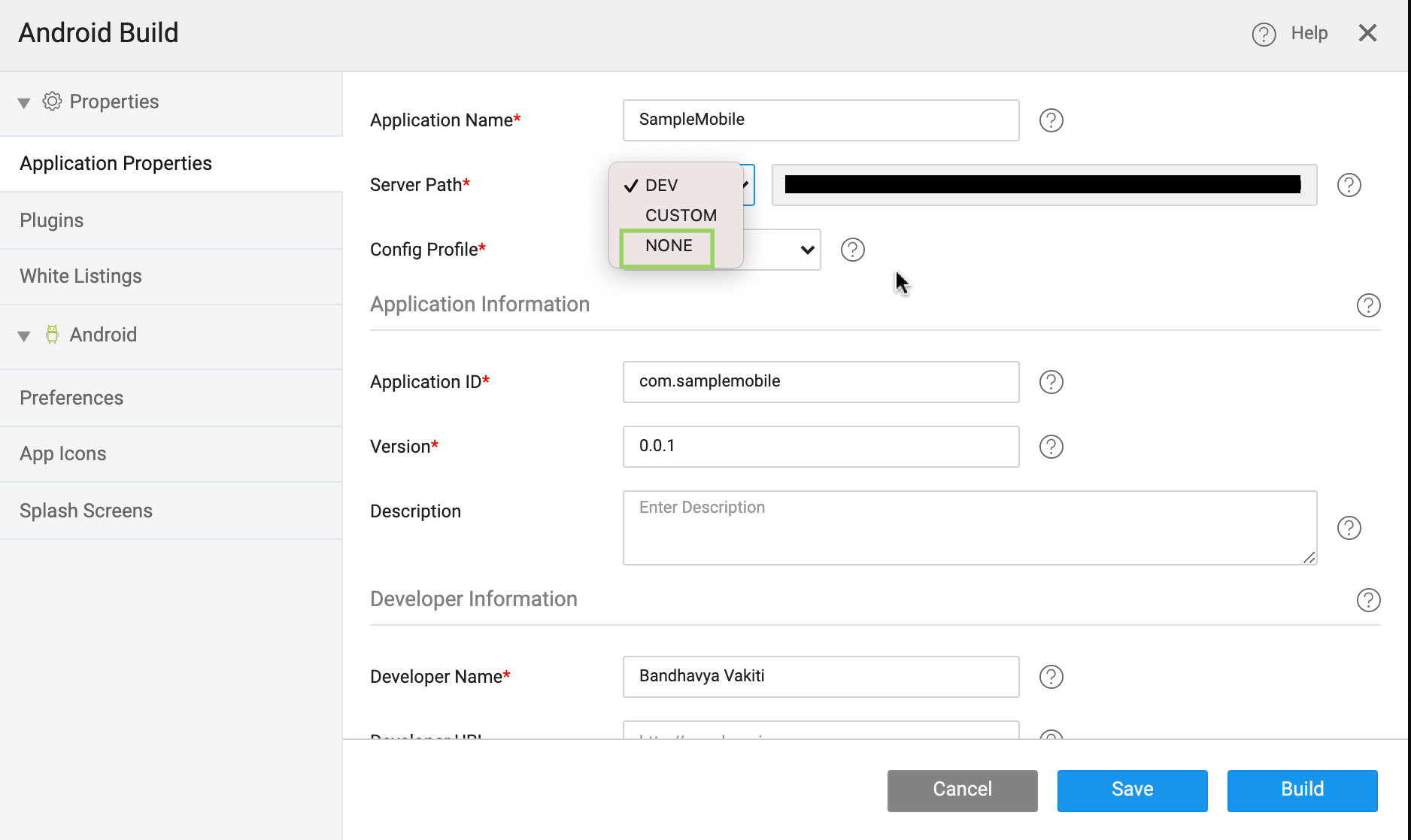 • Application Information: It displays information related to the app such as Application ID (by default, com.appname), Version (by default, 0.0.1) and you can edit the fields as per your requirements.