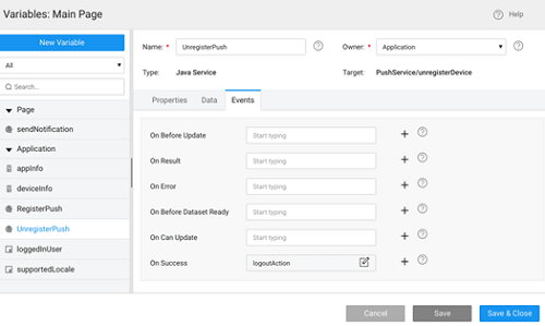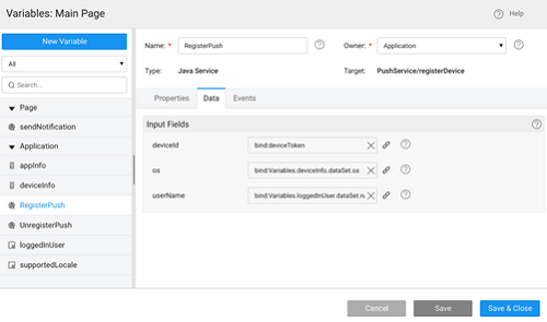 1. Create a service variable named RegisterPush to register the device to receive push notifications.