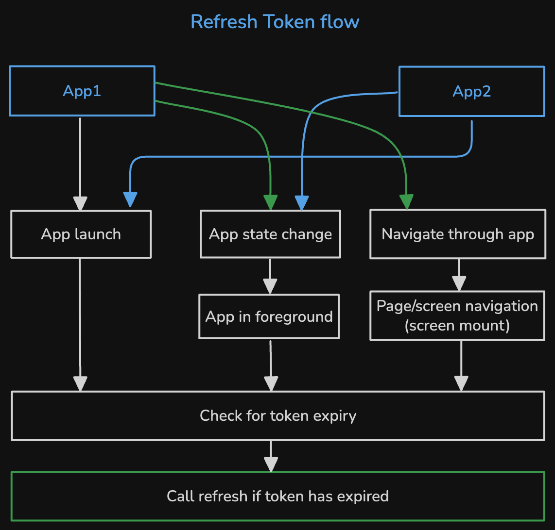 Subsequent applications can authenticate users automatically by reading the shared tokens stored by App 1. This process checks for valid tokens, refreshes them if needed, and logs the user in seamlessly without requiring manual authentication.