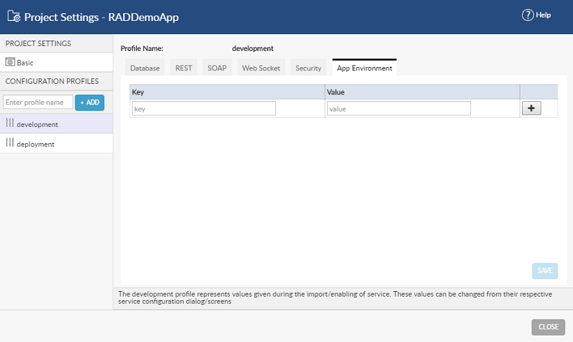 App Environment properties are custom server side properties defined by app developers to externalize certain properties into configuration profiles. These property values can be set to be different for different runtime environments. WaveMaker allows the definition of app environment properties for development profile and changes to the values as required for deployment or other profiles. See here for usage instructions #doc.