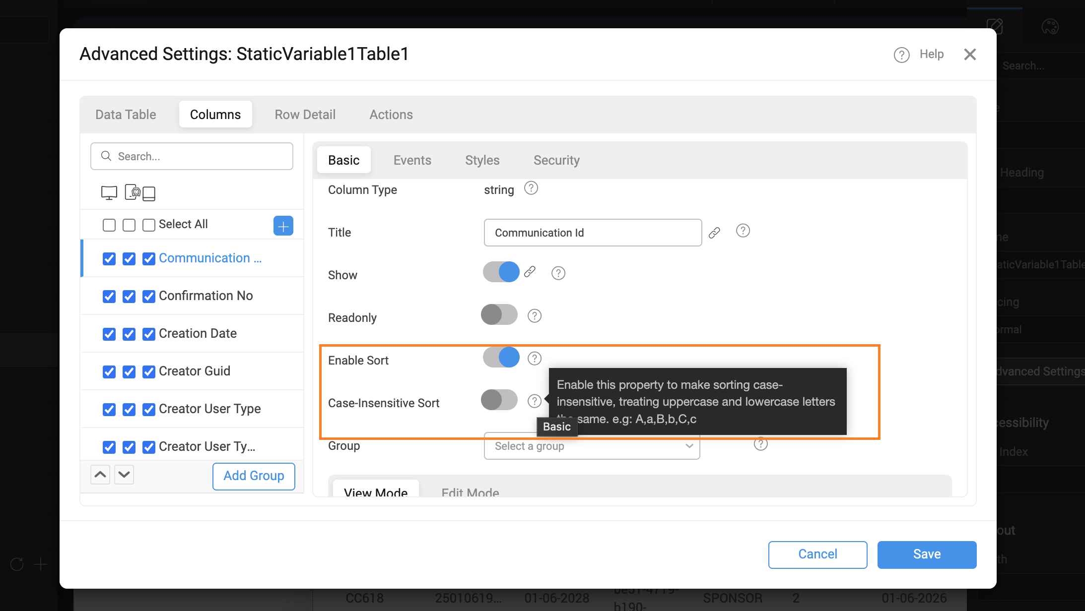 In this release we have added a new property, Case-Insensitive Sort. This property is to enable sorting without distinguishing between uppercase and lowercase letters. This property is available only for Model variables and Service variables and is shown when the Enable Sort property is enabled.