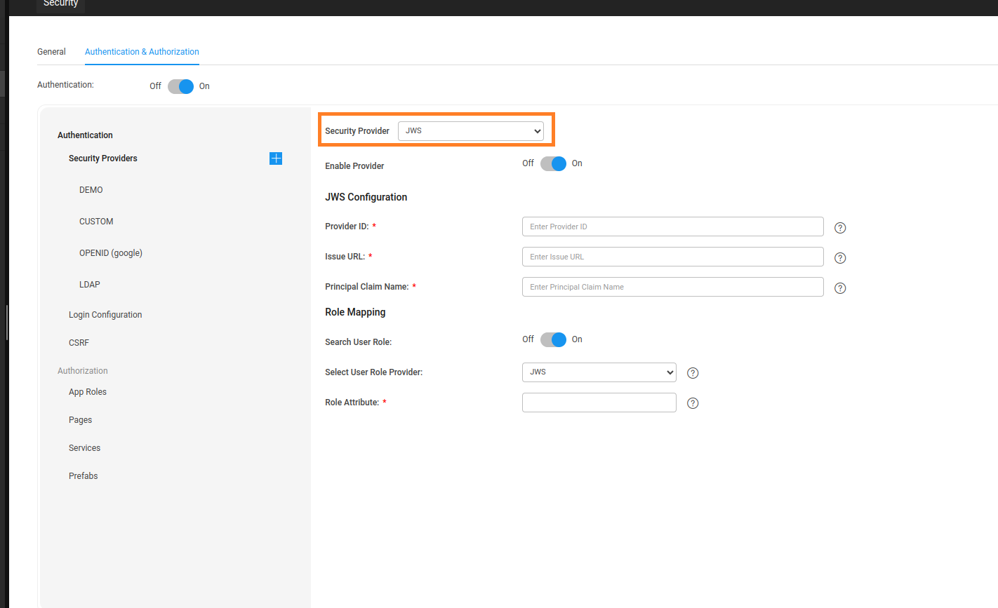 To apply JWS and Opaque security providers, users need to select the options from the Security Provider drop down available in Security under Settings.
