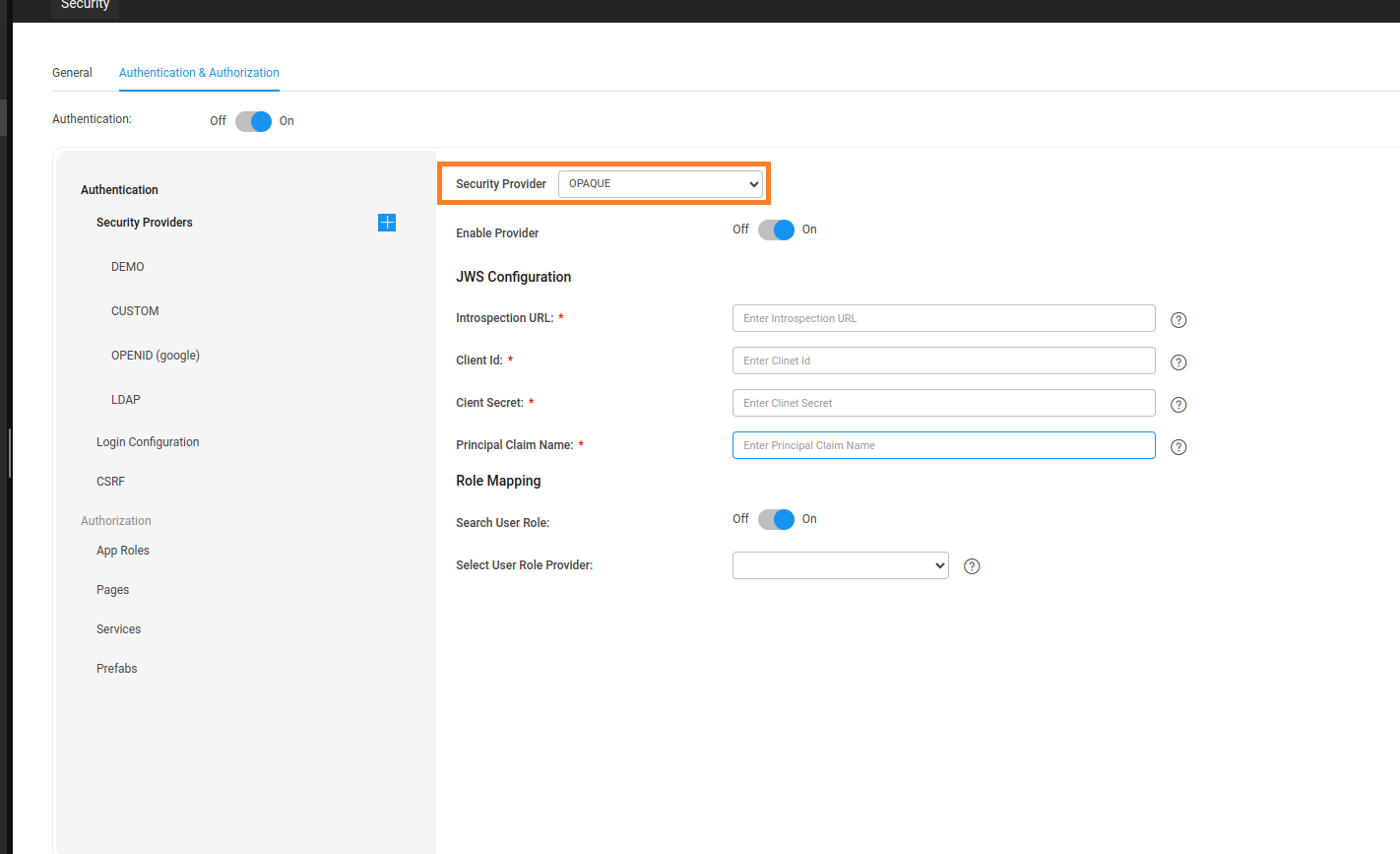 With this release, users can now select and cofigure JWS and Opaque security providers in security settings page like other security providers.